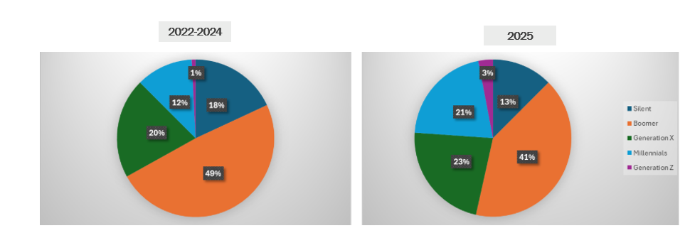 The chart above shows that while Baby Boomers and Silent Generation donors still made up the largest share of new donors system‑wide, that share is beginning to shift. In previous years, these groups represented roughly two‑thirds of all new donors. In 2025, that figure dropped to just over half. At the same time, giving among Gen X, millennials, and Gen Z continued to grow. Notably, the share of new donors under 45 — millennials and Gen Z — nearly doubled, rising from about 13% in prior years to 24% in 2025.