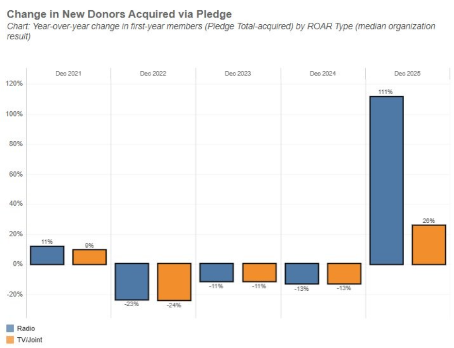 In 2025, the system experienced an extraordinary surge in giving driven by federal funding cuts. That moment mattered, and so did the data it produced. After several years of decline, on-air pledge rebounded, with radio stations doubling new donor acquisition through pledge year over year. For TV and joint licensees, results were positive at the median, though less consistent across stations, as seen in the chart below.