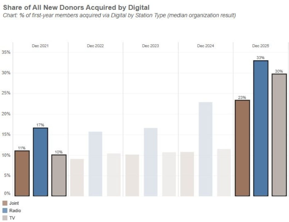 Even with the 2025 rebound, pledge as a source of new donors has been declining across radio, TV and joint licensees since 2021. For radio, 2025 marked the first time in the reporting period that fewer than half of new donors were acquired through pledge, as seen in the chart below.