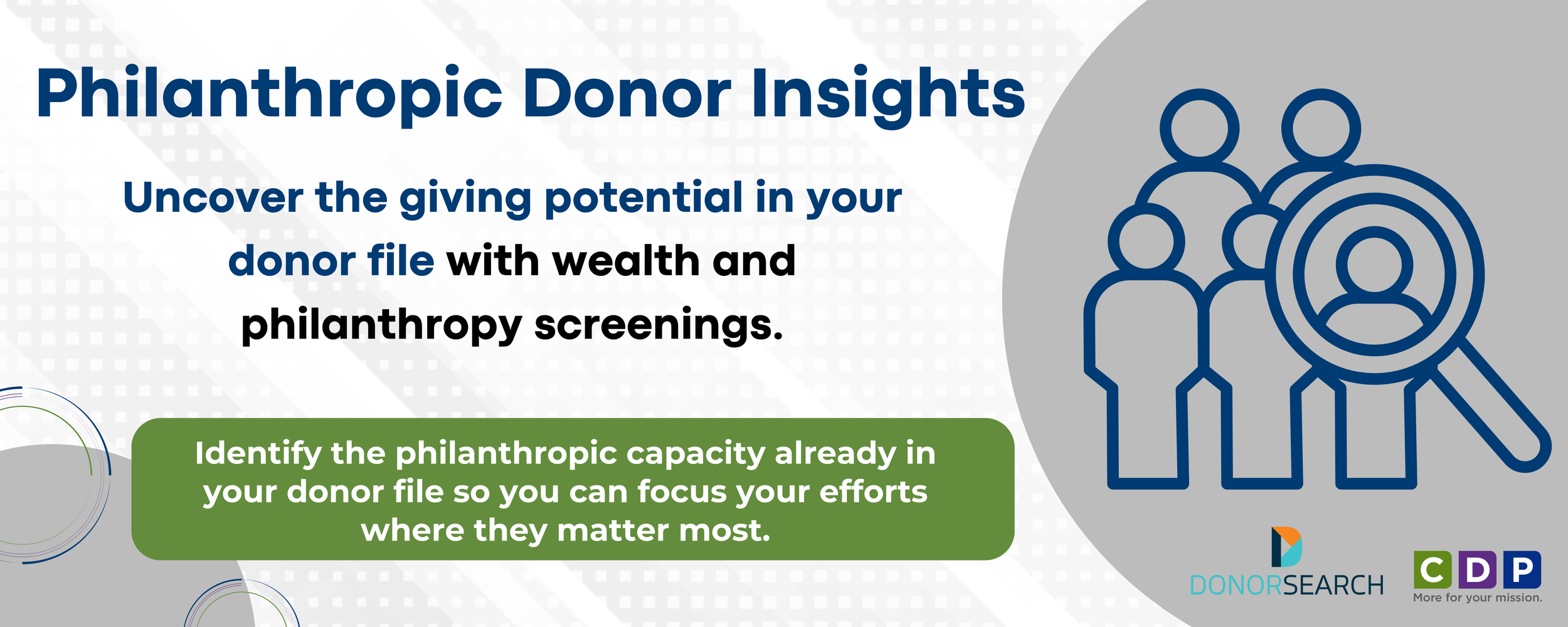 To successfully grow philanthropic giving, you need more than instinct—you need insight. DonorSearch uncovers the philanthropic capacity already in your donor file, helping you focus your efforts where they matter most.